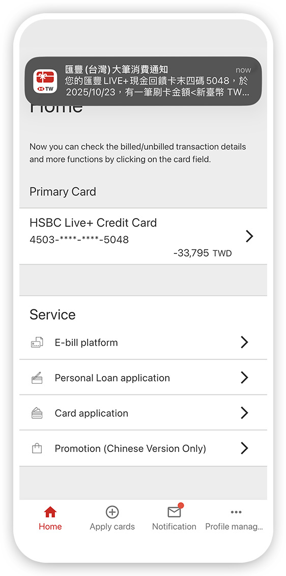 Please note that the username and password for HSBC(TW) Credit Card Internet Service and Credit Card App are the same.