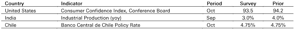 In the US, the Conference Board consumer confidence index is expected to nudge lower to 93.5 in October, from 94.2 in September. The labour market components will be closely watched for signs of weakness.