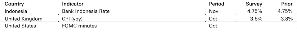 In the US, October's FOMC minutes should confirm diverging views on the trajectory for US growth and inflation over 2025 and 2026.