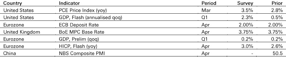 US PCE inflation likely rose to 3.5% yoy in March from 2.8% yoy in February, driven by lagged tariff pass-through and higher energy prices. GDP growth is expected to have rebounded in Q1, reflecting the end of the government shutdown, although consumer spending is likely to soften.
