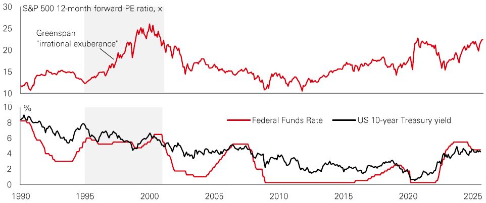 Investors should take the potential impact of AI seriously. The current bull run could continue for a while. But with many of the tailwinds of the 1990s now acting as headwinds, could Alan Greenspan’s (premature) bathtub musings of “irrational exuberance” in 1996 be more relevant to today’s market environment?