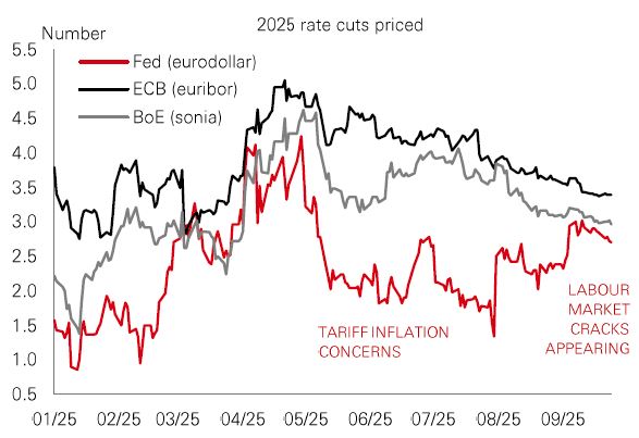 In the US, new FOMC member Stephen Miran was the lone dissenter (favouring a 0.5% cut) in an otherwise unanimous vote for a 0.25% cut (to 4.00-4.25%) on labour market weakness. Despite elevated inflation, the market is pricing two more 0.25% US cuts by year-end, and two in 2026.
