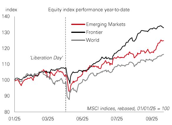 Frontier market stocks have outperformed both emerging and developed markets this year – with the MSCI Frontier index up 33%. That’s been driven by the tailwind of a weaker US dollar and the relatively insulated nature of Frontiers from global market volatility. Discounted valuations, steady profits growth, and strong structural stories have all attracted investors – and new policy easing by the Fed could be another catalyst.