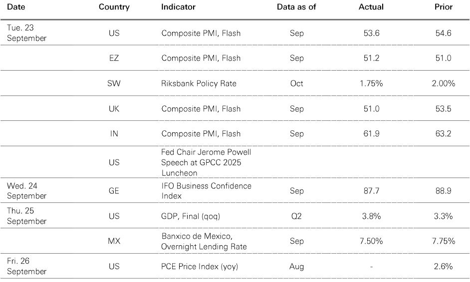 Source: HSBC Asset Management. Data as at 7.30am UK time 26 September 2025. For informational purposes only and should not be construed as a recommendation to invest in the specific country, product, strategy, sector or security. Any views expressed were held at the time of preparation and are subject to change without notice. Any forecast, projection or target where provided is indicative only and is not guaranteed in any way.