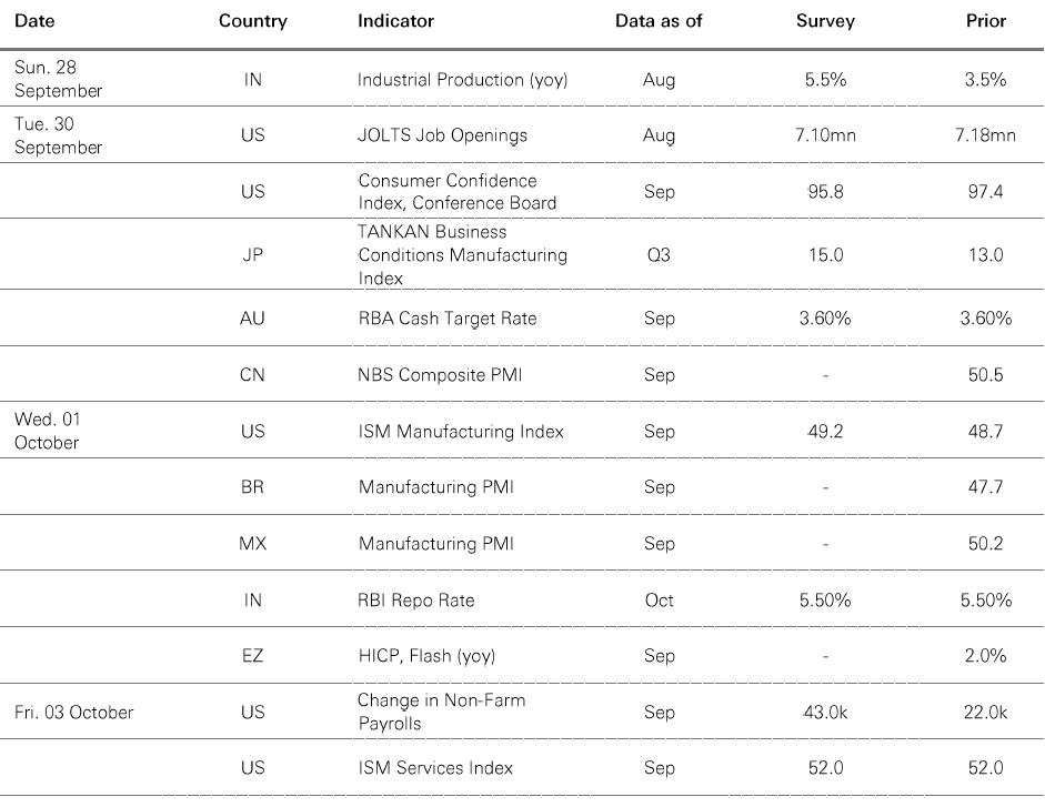 Past performance does not predict future returns. The level of yield is not guaranteed and may rise or fall in the future. For informational purposes only and should not be construed as a recommendation to invest in the specific country, product, strategy, sector, or security. Diversification does not ensure a profit or protect against loss. Any views expressed were held at the time of preparation and are subject to change without notice. Index returns assume reinvestment of all distributions and do not reflect fees or expenses. You cannot invest directly in an index. Any forecast, projection or target where provided is indicative only and is not guaranteed in any way. Source: HSBC Asset Management. Macrobond, Bloomberg. Data as at 7.30am UK time 26 September 2025.