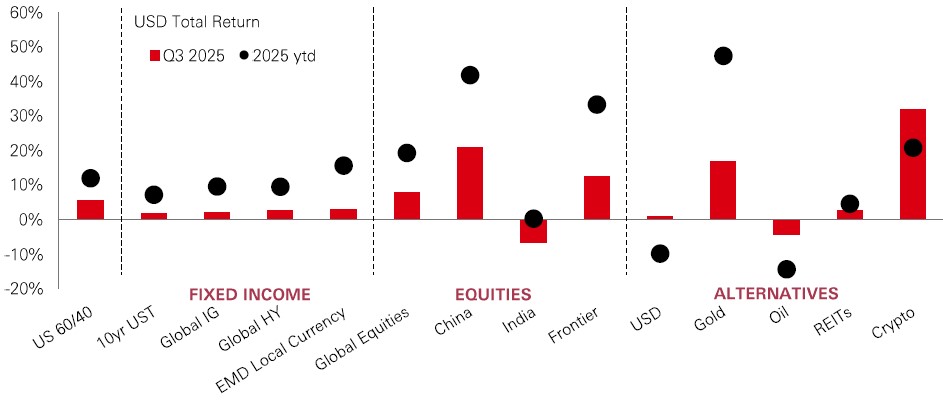 Past performance does not predict future returns. The level of yield is not guaranteed and may rise or fall in the future. For informational purposes only and should not be construed as a recommendation to invest in the specific country, product, strategy, sector, or security. Diversification does not ensure a profit or protect against loss. Any views expressed were held at the time of preparation and are subject to change without notice. Index returns assume reinvestment of all distributions and do not reflect fees or expenses. You cannot invest directly in an index. Any forecast, projection or target where provided is indicative only and is not guaranteed in any way. Source: HSBC Asset Management. Macrobond, Bloomberg. Data as at 7.30am UK time 26 September 2025.