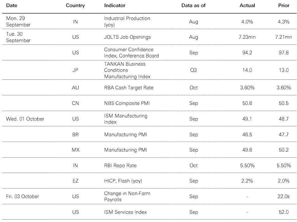The value of investments and any income from them can go down as well as up and investors may not get back the amount originally invested. Past performance does not predict future returns. The level of yield is not guaranteed and may rise or fall in the future. For informational purposes only and should not be construed as a recommendation to invest in the specific country, product, strategy, sector, or security. Diversification does not ensure a profit or protect against loss. Any views expressed were held at the time of preparation and are subject to change without notice. Any forecast, projection or target where provided is indicative only and is not guaranteed in any way. Source: HSBC Asset Management, Bloomberg, Macrobond. Data as at 7.30am UK time 03 October 2025.