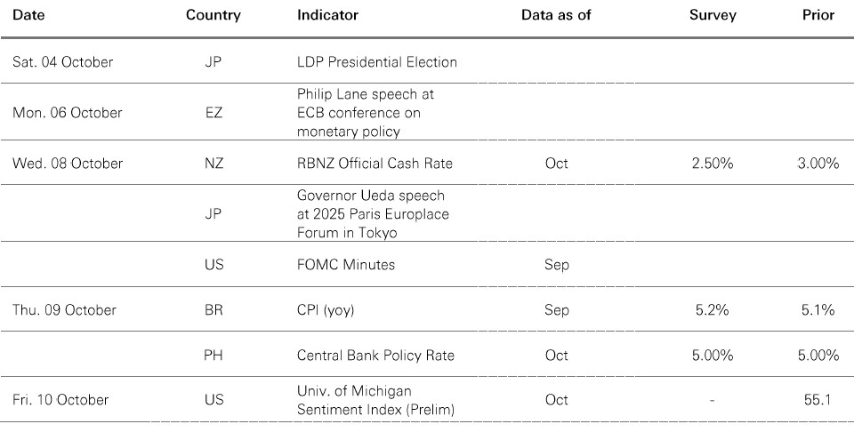 Positive market sentiment persists, driven by ongoing expectations of further Fed easing and enthusiasm around AI developments, despite rising political uncertainty in the US. The US dollar index weakened as a weak ADP employment report boosted US Treasures, with market still anticipating four to five 0.25% rate cuts by end-2026. In equity markets, US indices advanced, propelled by tech stock performance. The S&P 500, Euro Stoxx 50 and Nikkei 225 all hit record highs. Meanwhile, Asian markets largely rose at the start of Q4, supported by positive tech news. South Korea’s Kospi and Hong Kong’s Hang Seng surged, while India’s Sensex posted modest gains amid further easing signal from the RBI. China’s Shanghai Composite closed higher before October Golden Week holiday. In commodities, oil prices fell amid growing oversupply concerns, whilst gold prices reached an all-time high.