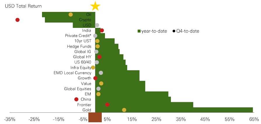 Other winners in Q4 include EM local currency bonds, which have benefitted from high real yields, solid fundamentals, and a weaker US dollar. Gold remains one of the year’s best performers. But among the laggards, oil has continued to trend lower amid a supply surplus. And cryptocurrencies have also sold off, potentially unsettling retail investors that have otherwise been keen buyers in markets this year.