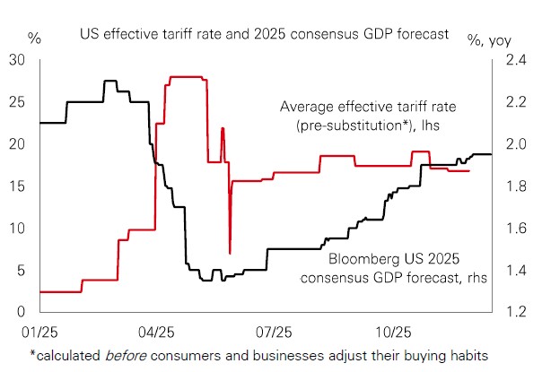 Two themes dominated discussions around the US economy in 2025 – tariffs and AI. Coming into the year, growth expectations were robust and rising. But investors got a shock on 2 April – “Liberation Day” – when President Trump announced swingeing tariffs. Markets buckled and growth expectations were cut sharply.