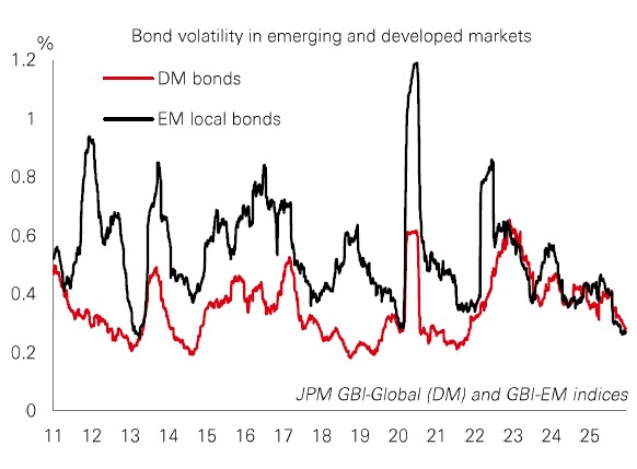 The stellar performance of emerging market assets has been a highlight of investment markets this year. Once seen as a high risk, high beta play, EM bond volatility is now lower than in developed markets.