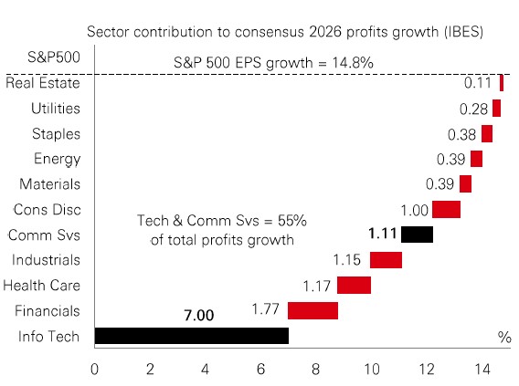 A core scenario of a coming together of global GDP and profits growth in 2026 suggests that stock market broadening out can continue next year. In global tech, that means regions like EAFE, Asia and emerging markets may be better placed as a source of both value and profits upside.