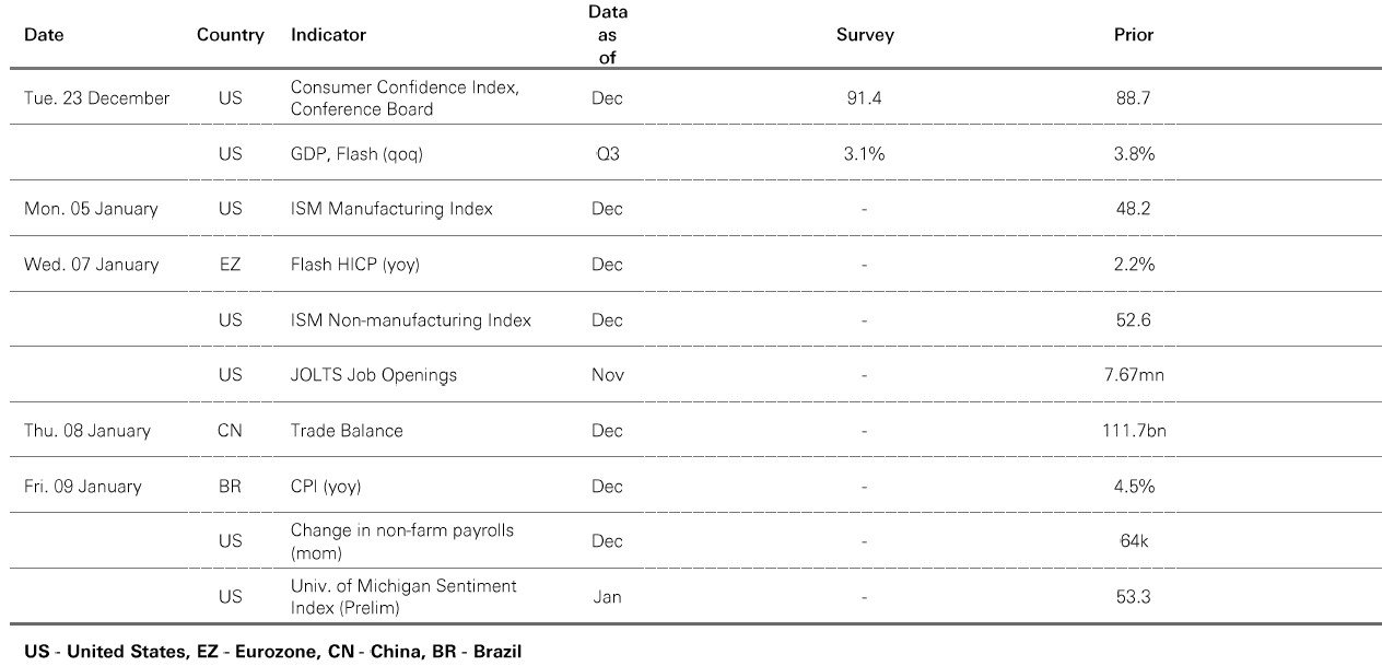 Past performance does not predict future returns. The level of yield is not guaranteed and may rise or fall in the future. For informational purposes only and should not be construed as a recommendation to invest in the specific country, product, strategy, sector, or security. Diversification does not ensure a profit or protect against loss. Any views expressed were held at the time of preparation and are subject to change without notice. Index returns assume reinvestment of all distributions and do not reflect fees or expenses. You cannot invest directly in an index. Any forecast, projection or target where provided is indicative only and is not guaranteed in any way. Source: HSBC Asset Management. Macrobond, Bloomberg. Data as at 7.30am UK time 19 December 2025.