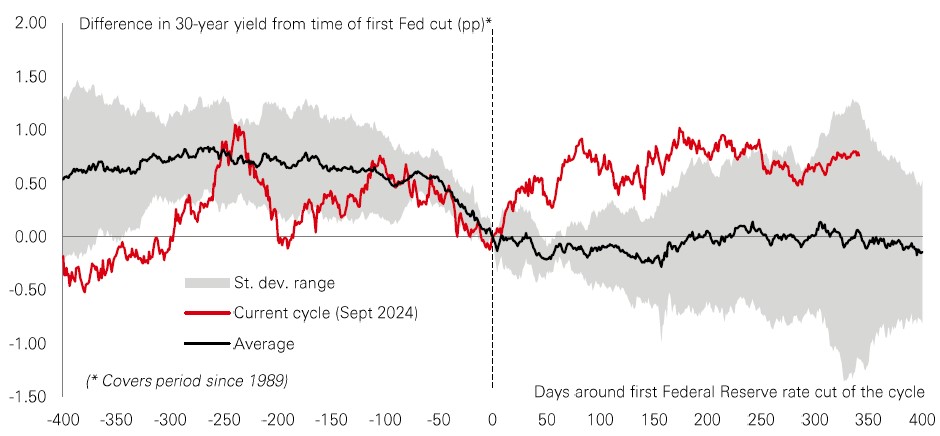 1. Long-term bond yields are unusually sticky, even as the Fed cuts rates. This is the mirror image of the 2000s-2010s playbook, and one that we call the “reverse conundrum” (see chart).