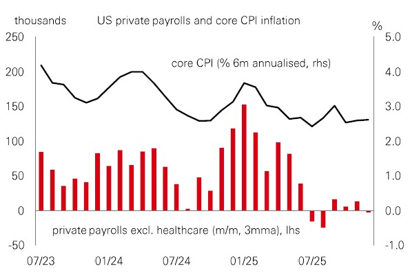 On that score, headline US data have not thrown up any nasty surprises, although some of the details require careful monitoring. Q3 GDP surpassed expectations, although growth was unbalanced – robust consumer spending relied on a falling savings rate, while, outside of AI-related capex, investment was soft. The labour market remains a conundrum – firms are stuck in a “low hire, low fire” equilibrium and consumers are pessimistic about job prospects. Inflation in the high twos is not where the Fed wants it to be, but moderating wage growth and a soft housing market point to gradually easing price pressures this year.