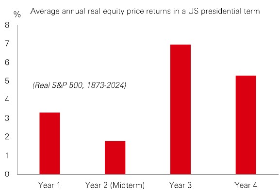 Historically, the second year of a US presidential term tends to be a tricky one for markets. It’s often the weakest year for real stock returns in the S&P 500, thanks to the uncertainty that midterm elections bring. Investors don’t like surprises; unexpected policy shifts and questions about the economic outlook often weigh on risk appetite during this period.