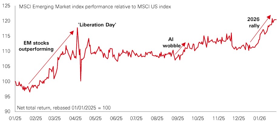 Emerging market stocks have gotten off to an exceptionally strong start in 2026 – with the MSCI EM index up by around 11% in USD terms, versus just 2.0% for the MSCI US. In some ways, it’s a case of history repeating. This time last year, a sharp decline in the US dollar was under way, and EM stocks were strengthening just as US stocks were fading. After the volatility around April’s ‘Liberation Day’ tariff surprise, EM markets went on to outperform the US for the full year.