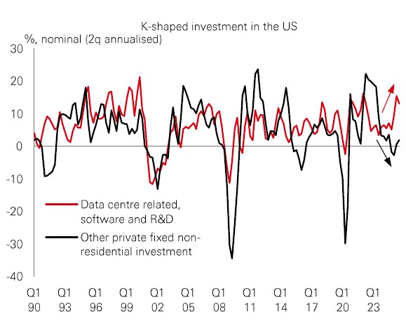 The Fed left rates unchanged at its January meeting, opting to assess how multiple shocks – trade tariffs, an immigration clampdown, an AI investment boom and a government shutdown – pass through the economy. Thus far, the net result has been surprisingly resilient growth, but the headline strength masks some imbalances. K-shaped dynamics remain in play and are most evident in capex – AI related investment is booming while other capex remains weak.