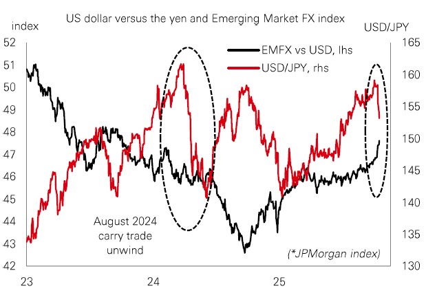 A lightning rod of sudden yen strength is the impact on “carry trades”, Carry strategies borrow in low-rate currencies like the yen to invest in higher-yielding currencies elsewhere, often in EMs. When the strategy unwinds – either on rising rates or currency strength – it can spark volatility. A similar move in August 2024 was blamed for a rapid sell-off in US tech stocks.
