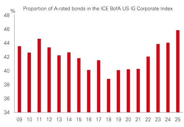Investment grade (IG) credit is popular for its high all-in yields, strong credit quality, and defensive characteristics. The average credit quality within IG has also been improving – with 2025 being the first year since 2011 when A-rated bonds represented a higher proportion of the index than BBB-rated bonds. At the same time, the average all-in yield on IG is now an eye-catching 1% higher than it was in 2011.