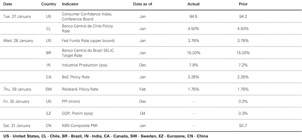 The value of investments and any income from them can go down as well as up and investors may not get back the amount originally invested. Past performance does not predict future returns. The level of yield is not guaranteed and may rise or fall in the future. For informational purposes only and should not be construed as a recommendation to invest in the specific country, product, strategy, sector, or security. Diversification does not ensure a profit or protect against loss. Any views expressed were held at the time of preparation and are subject to change without notice. Any forecast, projection or target where provided is indicative only and is not guaranteed in any way. Source: HSBC Asset Management, Bloomberg, Macrobond. Data as at 7.30am UK time 30 January 2026.