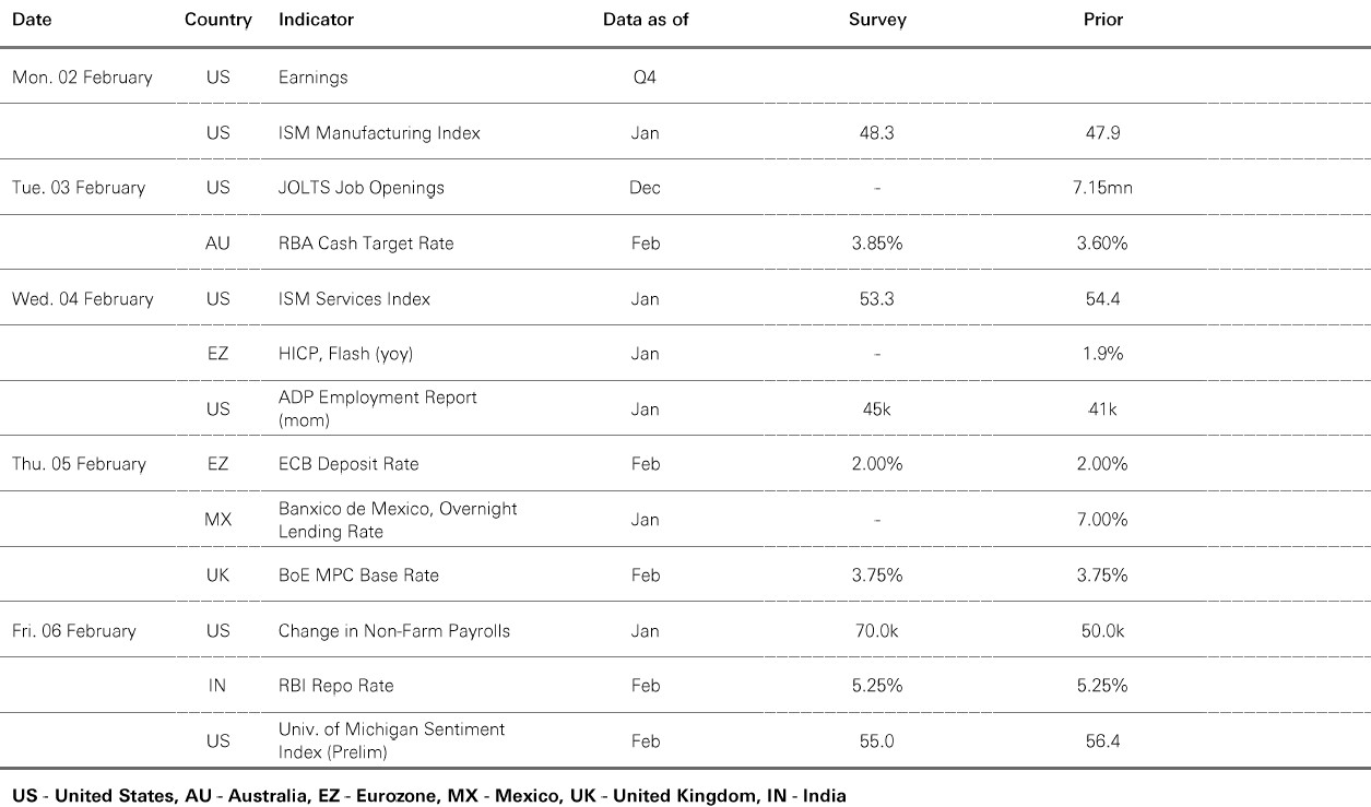 Risk markets continued to rally last week, with broad gains across EM stock indices, including those in Asia and Latin America, as the US dollar index softened further. In commodities, both precious and industrial metals prices rallied but largely pared their gains over the week, while oil prices rose amid lingering geopolitical tensions. 10-year US Treasury yields increased modestly, with the Fed keeping policy rates unchanged and Chair Powell noting that the US economic outlook has “clearly improved”. Meanwhile, JGB yields retreated mildly, alongside lower European sovereign yields, while spreads on US and European high-yield credits widened. Across DM equities, the S&P 500 reached an all-time high amid mixed Q4 US corporate earnings. Conversely, the Euro Stoxx 50 fell, as did the German DAX. Elsewhere, Nikkei 225 also slid following a stronger yen.