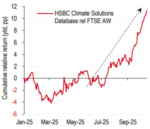 HSBC Research’s analysis of climate stocks by region and sector suggests that the recent price outperformance is broad-based, marking a notable turnaround from the challenging outlook earlier in the year. Political backlash, deteriorating sentiment attached to sustainable investing, and concerns associated with greenwashing and regulatory changes had an adverse impact on the performance of climate stocks in the HCSD in the first few months of 2025.
