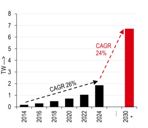 Global renewable energy pledges and policies are driving the growth of renewables and solar power. These include plans to triple renewable energy generation capacity to at least 11TW by 2030 (COP28); end a reliance on fossil fuels (REPowerEU); mobilize USD1trn in solar energy investments by 2030 (International Solar Alliance), and numerous supportive national policies and targets set by countries such as China, India, UAE, South Africa and Brazil. Furthermore, to align with the IEA6 net-zero scenario, solar generation needs to reach approximately 9,200TWh by 2030, requiring an annual average growth rate of around 28% from 2024 levels.