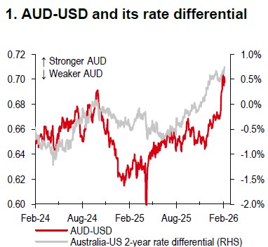 The AUD’s recent rally looks a bit stretched, up c3.5% against the USD year-to-date (Bloomberg, 6 February). Consequently, AUD-USD is likely to consolidate over the coming weeks, with external factors − rather than rate differentials − driving moves over the near term (Chart 1).