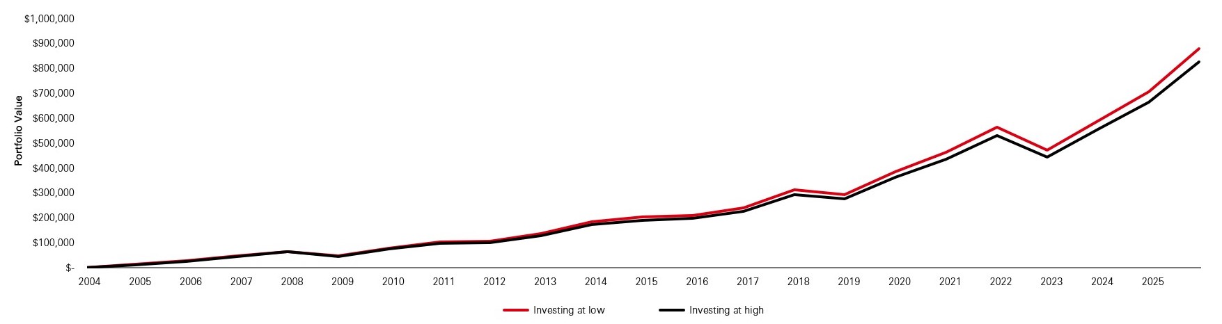 Chart 1 shows what happened to $1,000 invested in global stocks at the monthly low or high, every month since January 2004. Whether investing at the monthly low or high, it does not create a significant difference in the end value.