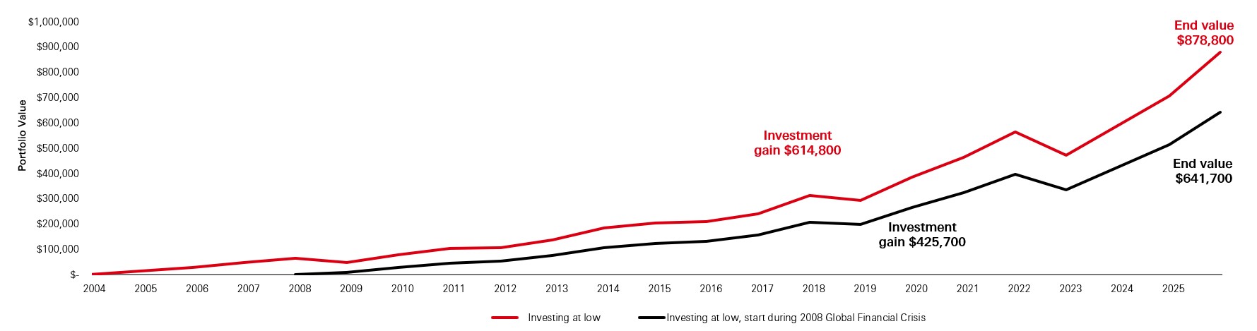 If your aim is to grow your savings over the long term, starting to invest sooner, rather than later, is usually more important than whether you are investing at low or high points in financial markets. The longer the investment period, the greater the compounding or snowball effect. Reinvesting your earnings allows your original investment to continue growing along with the money generated by your investment.
