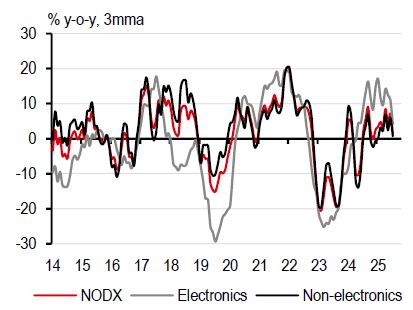 As a trade-dependent economy, Singapore has benefitted well from trade frontloading. On a y-o-y basis, manufacturing has outshone other sectors, growing 5.4% y-o-y. This is particularly evident in two of Singapore’s growth pillars: electronics and pharmaceuticals. Meanwhile, recent high frequency non-oil domestic exports (NODX) data also point in the same direction. The electronics NODX growth remained at double-digits until decelerating notably in July. This suggests to us that frontloading trade has already peaked, ready for some payback in 2H25.