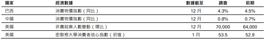 中國12月消費物價指數通脹可能由11月的0.7%(同比)略升至0.8%(同比),主要受食品價格上漲推動,整體需求壓力依然疲弱。