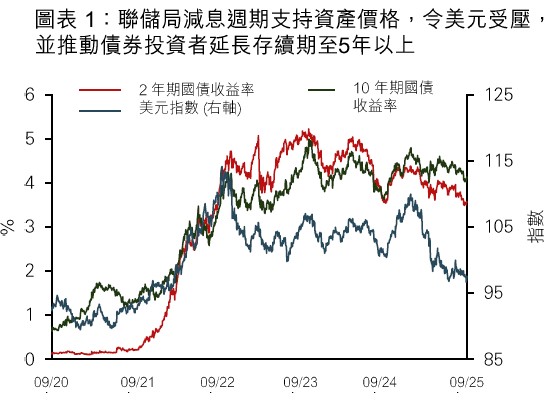 • 聯儲局重啟減息週期,推動股票、債券及黃金齊創新高。回顧歷史,聯儲局恢復寬鬆政策後的 12 個月內,股票與債券往往表現不俗;我們現時預期今年將另有兩次各 0.25% 的減息。我們對 10 年期美國國債收益率於年底的預測為 4.3%,目前收益率已低於此水平,因此我們將美國國債的存續期下調為 5 至 7 年。