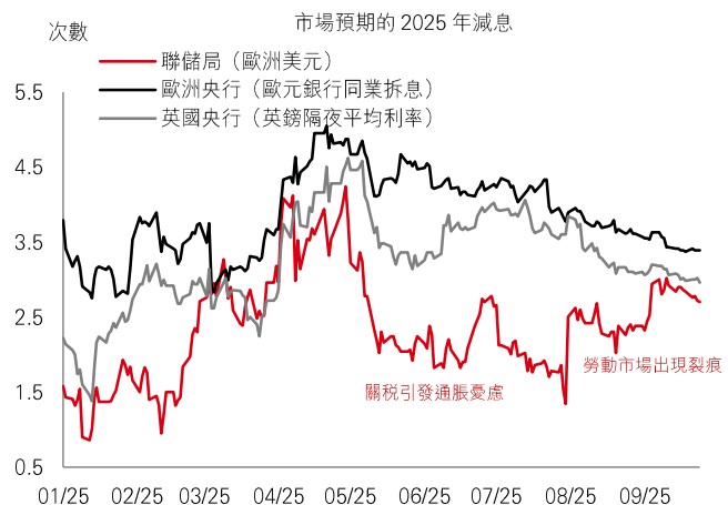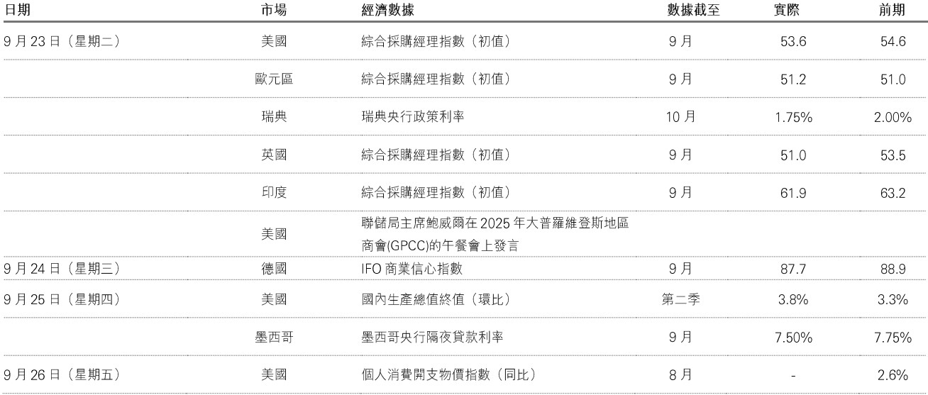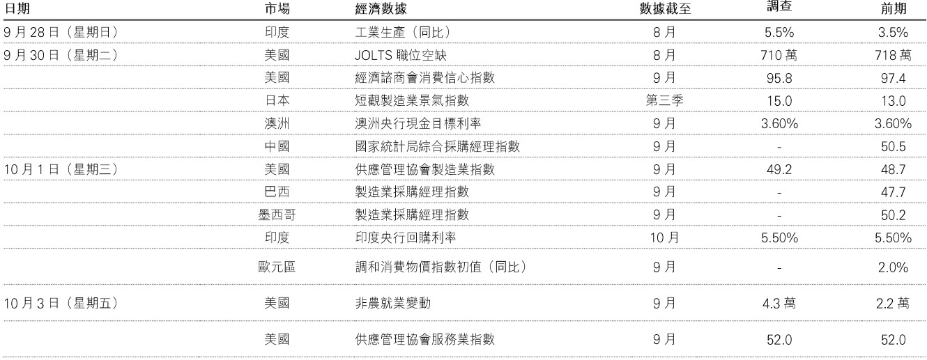 過往表現並非未來回報指標。息率水平不獲保證,日後可升或可跌。僅供參考,不應視為投資特定國家、產品、策略、行業或證券的建議。多元化並不能確保盈利或防止虧損。所表達的任何觀點均截至編製為止,如有更改,恕不另行通知。指數回報假設所有分派再投資,不反映費用或開支。您不能直接投資於指數。所提供的任何預測、預計或目標僅供參考,概非任何形式保證。資料來源:滙豐投資管理。Macrobond及彭博。數據截至2025年9月26日(英國時間上午7時30分)。