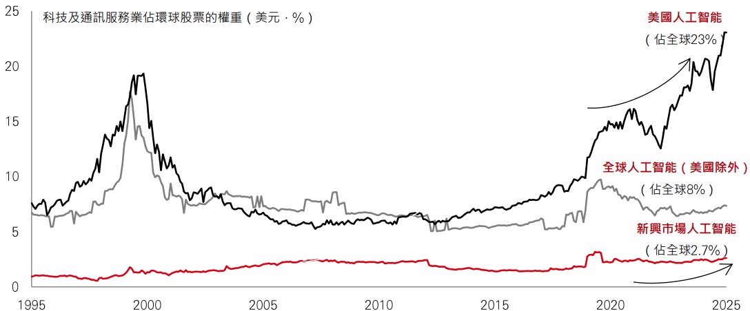 人工智能的凌厲升勢在2025年推動了投資市場,其中美國科技和通訊服務股錄得卓越利潤增長,帶動市場屢創新高。由於估值急升,單計此兩大美國行業的市值,便佔現時所有環球股票市值近四分之一。