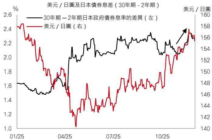 在新任首相高市早苗領導下,日本政府近期通過大規模財政刺激方案(估計佔GDP約3%)。現時新領導層顯然準備好動用更積極的財政政策支持增長。但由於日本的債務水平本來已高企,此舉推高了長期債券息率,同時為日圓帶來下行壓力,使日本央行陷入困境。日本央行自2024年3月開始推行政策正常化以來一直態度審慎,現時央行日益受壓,需要加快提高政策利率,當局甚至可能需採取其他措施支持日圓。