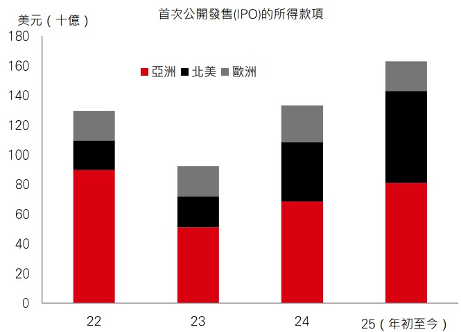 就集資額而言,亞洲首次公開發售(IPO)市場的表現冠絕全球,年初至今已集資810億美元。數字較2023年增長近60%。據行業數據顯示,關稅擔憂減退和聯準會減息,令第三季IPO市場更為強勁。尤其是香港重奪新股上市中心的地位,這受惠於其「第二上市」支援政策,及設有快速通道吸引科技企業。中國內地境內市場及其他東盟中心亦蓬勃發展。印度表現突出,各個行業的新股上市數量急增,零售需求強勁。