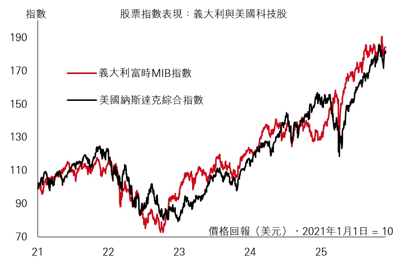 不過,義大利股市的表現卻截然不同。雖然科技和人工智能備受追捧,但義大利富時MIB指數年初至今的表現竟悄悄跑贏美國納斯達克指數。這並非短暫現象——自2021年初以來,義大利股市的升幅一直與美國科技股比肩。背後的動力主要源自於行業組成,義大利富時MIB指數主要由銀行、能源和工業週期股構成,這些股票在高利率及通脹,以及商品價格波動的環境下表現相對出色。政府債券息差下降亦推高了股票市盈率。