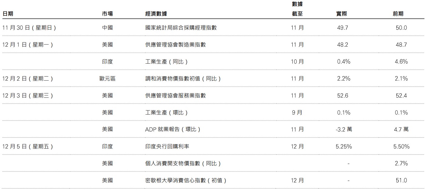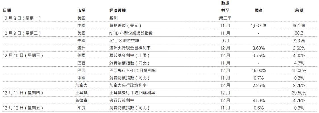 資料來源:滙豐投資管理。數據截至2025年12月5日(英國時間上午7時30分)。僅供參考,不應視為投資特定國家、產品、策略、行業或證券的建議。所表達的任何觀點均截至編製為止,如有更改,恕不另行通知。所提供的任何預測、預計或目標僅供參考,概非任何形式保證。滙豐投資管理對未能達到該預測、預計或目標,概不承擔任何責任。美國政府停擺終結,但預期官方數據公布仍有機會推遲