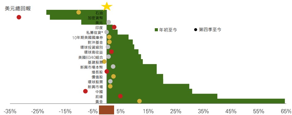 第四季其他表現優秀的資產包括新興市場本幣債券,其受惠於高實際息率、基本因素穩健,及美元轉弱。黃金同樣向好,是今年表現最佳的資產之一。在表現落後的資產之中,石油因為供應過剩而價格持續走低。加密貨幣亦遭拋售,這可能讓今年於市場內積極買入的零售投資者感到憂慮。