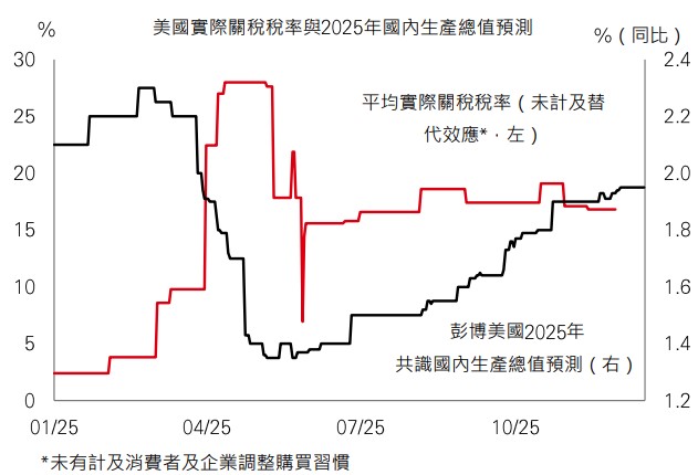 2025年圍繞美國經濟的討論以兩個主題為主:關稅和人工智能。年初,市場的增長預期強勁,且持續向上。但投資者在4月2日「解放日」受到衝擊,因美國總統特朗普宣布大幅加徵關稅。市場隨即向下,增長預期亦大幅下調。
