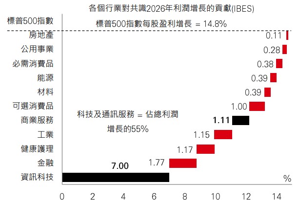 利潤增長急升和人工智能熱潮持續,推動了今年大型科技股的強勁表現,同時將美股推向新高。明年的前景亦受到支撐,預期科技和通訊服務業將共同貢獻55%總利潤增長。