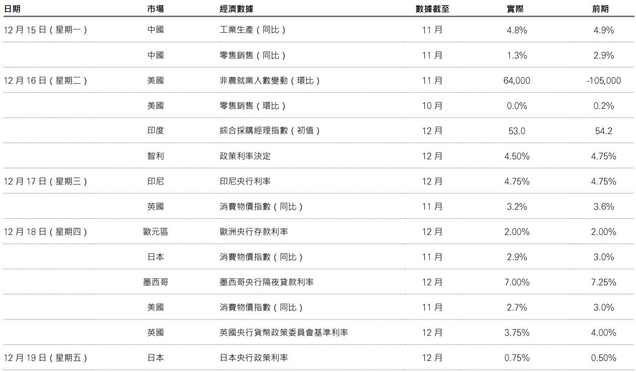 環球股市於年底出現聖誕升勢的期望在上週落空,投資者先後消化一系列央行會議、美國就業報告疲弱,及美國通脹數據溫和。美元兌主要貨幣變動不大,十年期美國國庫券息率則下降。美股本週初乏力,但其後轉強。歐洲方面,英國央行減息0.25%,但暗示「難以確定」會否進一步放寬政策;歐洲央行則上調2026年歐元區的通脹預測。道瓊斯歐洲50指數跌幅溫和。亞洲方面,科技股轉弱使日本日經225指數受壓,南韓Kospi指數亦因科技業波動而受拖累。恒生指數、中國上證綜合指數和印度Sensex指數本週均轉弱。此外,金價延續近期升勢,油價則進一步回軟。
