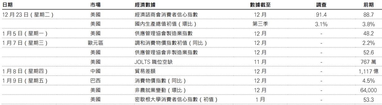 過往表現並非未來回報指標。息率水平不獲保證,日後可升或可跌。僅供參考,不應視為投資特定國家、產品、策略、行業或證券的建議。多元化並不能確保盈利或防止虧損。所表達的任何觀點均截至編製為止,如有更改,恕不另行通知。指數回報假設所有分派再投資,不反映費用或開支。您不能直接投資於指數。所提供的任何預測、預計或目標僅供參考,概非任何形式保證。成本可能因匯率波動而變化。資料來源:滙豐投資管理。Macrobond及彭博。數據截至2025年12月19日(英國時間上午7時30分)。