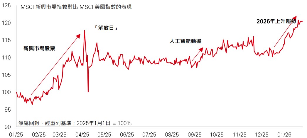 2026年新興市場股票開局異常強勁:MSCI新興市場指數以美元計價上升約11%,對比MSCI美國指數僅升2.0%。某程度上,歷史正在重演。去年同期,美元大幅下跌,而新興市場股票在美股回落時轉強。在4月「解放日」造成意外的關稅衝擊引發波動後,新興市場全年表現一直領先美國。