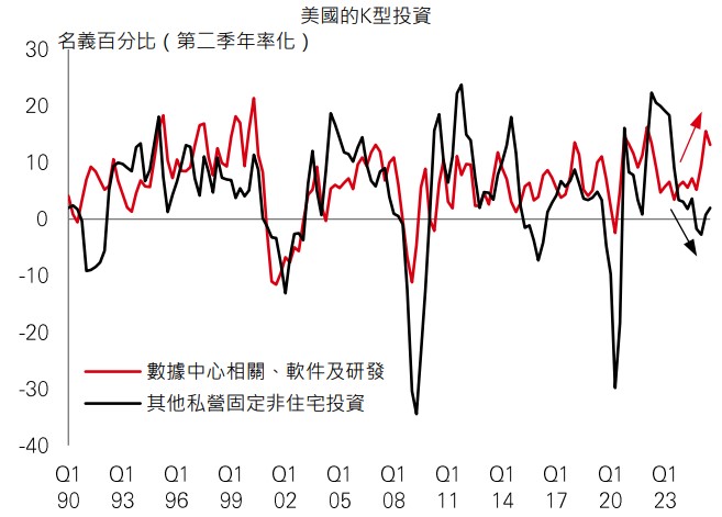 聯準會在1月會議上維持利率不變,選擇評估多重衝擊對經濟的影響,其中包括貿易關稅、移民限制、人工智能投資熱潮和政府停擺。目前為止,增長依然意外地穩健,但整體的強勢之下有一些不平衡情況。K型動態持續,這在資本支出尤其明顯——人工智能相關投資蓬勃,但其他資本支出依然疲弱。