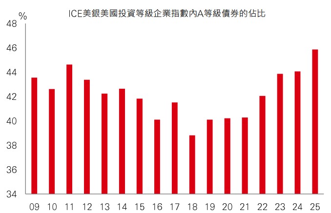 投資級別信貸因其高綜合息率、良好信貸素質和防守特質而受到青睞。投資級別的平均信貸素質亦一直提升,2025年是自2011年以來首個年度,投資等級A債券在指數的佔比高於BBB等級債券。同時,投資級別的平均綜合息率現時較2011年大幅高出1%。