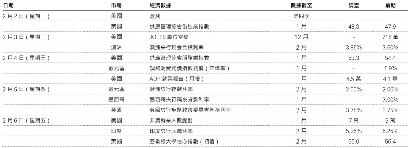 投資價值及其任何收益可升可跌,投資者可能無法收回最初投資的金額。過去表現不能預測未來回報。息率水平不獲保證,日後可升或可跌。僅供參考,不應視為投資特定國家、產品、策略、行業或證券的建議。多元化並不能確保盈利或防止虧損。所表達的任何觀點均截至編製為止,如有更改,恕不另行通知。所提供的任何預測、預計或目標僅供參考,概非任何形式保證。資料來源:滙豐投資管理、彭博及Macrobond。數據截至2026年1月30日(英國時間上午7時30分)。