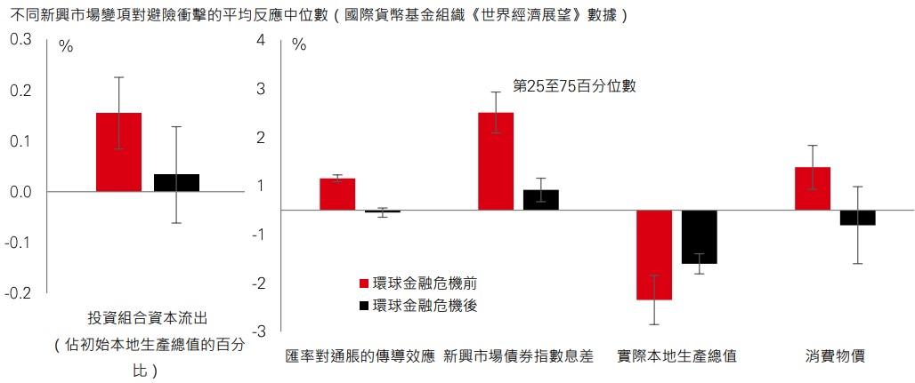 上圖正好說明這一點。與環球金融危機前相比,現時新興市場經濟體的抗壓能力明顯提升。資金外流不算嚴重,貨幣走弱傳導至通膨的程度較低,整體增長所受衝擊亦普遍較小。換言之,新興市場不再是脆弱的順周期板塊,而更像是一組由更強大、亦更具可信度的政策框架所支撐的經濟體。
